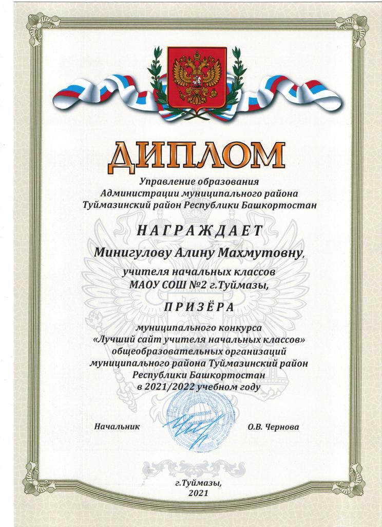 С 11 по 29 октября 2021 года проводился муниципальный конкурс «Лучший сайт учителя начальных классов» муниципального района Туймазинский район РБ. Среди конкурсантов была Минигулова Алина Махмутовна, учитель начальных классов МАОУ СОШ N 2 г.Туймазы. Сайты учителей оценивали оценивали по следующим критериям: наличие обновляющегося содержания, информационная насыщенность, безопасность и комфортность виртуальной образовательной среды, актуальность информации, оригинальность и адекватность дизайна. Учитель нашей школы стала призером, заняв 2 место.