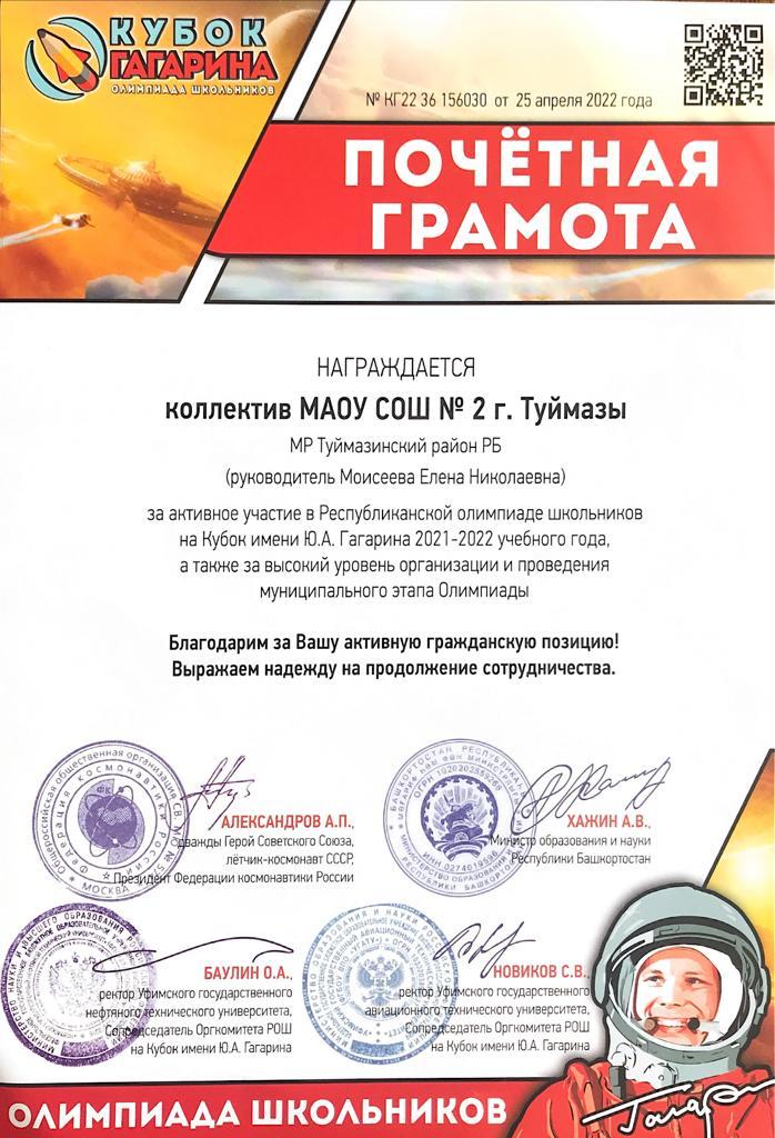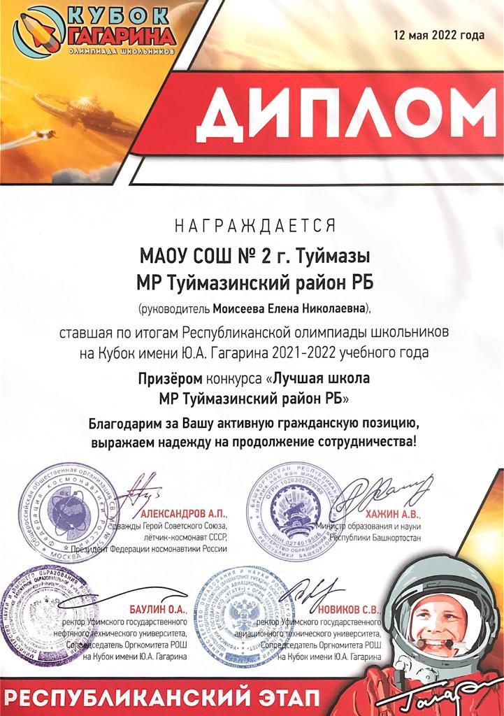 Наша школа принимала активное участие в Республиканской олимпиаде школьников на Кубок имени Ю.А.Гагарина в 2021-2022 учебном году и стала Призером конкурса «Лучшая школа МР Туймазинский район РБ»